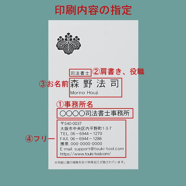 司法書士様向けの両面抗菌・抗ウイルス特殊加工が施された名刺。フォントの指定が可能です。
